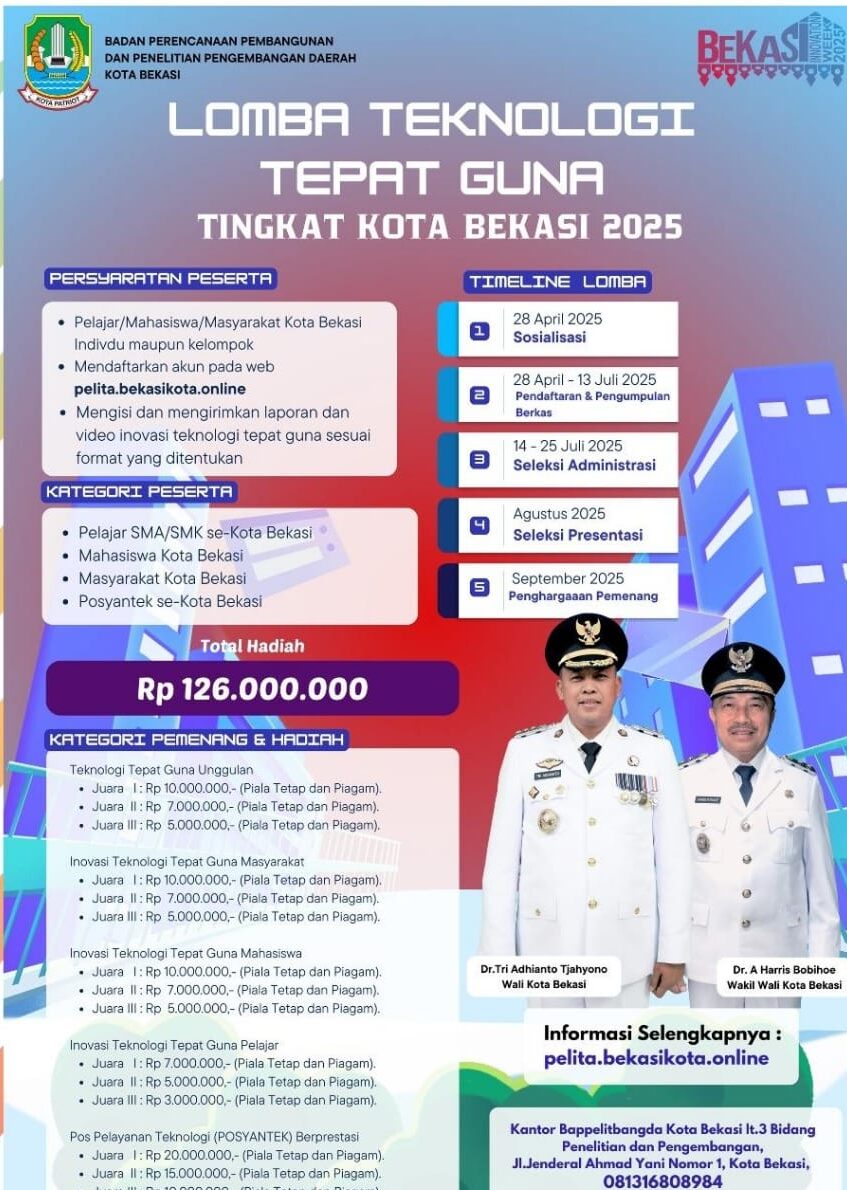 Informasi lebih lengkap seputar Kompetisi Teknologi Tepat Guna Kota Bekasi 2025 dapat diperoleh melalui situs pelita.bekasikota.online, atau dengan menghubungi Bidang Penelitian dan Pengembangan Bappelitbangda Kota Bekasi, Gedung C Lantai 3, Komplek Kantor Wali Kota Bekasi, Jalan Jenderal Ahmad Yani No. 1, Bekasi.//***ADV MitraBangsa.Online.
