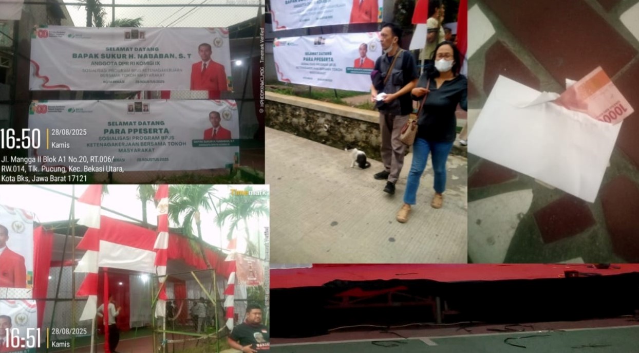 Acara yang digelar di Perumahan Taman Wisma Asri RT 006 RW 014, Kelurahan Teluk Pucung, Kecamatan Bekasi Utara pada Kamis, 28 Agustus 2025, dihadiri oleh pihak BPJS Ketenagakerjaan, tim dari anggota DPR RI Sukur Nababan, Kapolsek Bekasi Utara, Danramil Bekasi Utara, Camat Bekasi Utara, serta sejumlah tokoh masyarakat yang diundang secara tertutup melalui grup WhatsApp panitia.